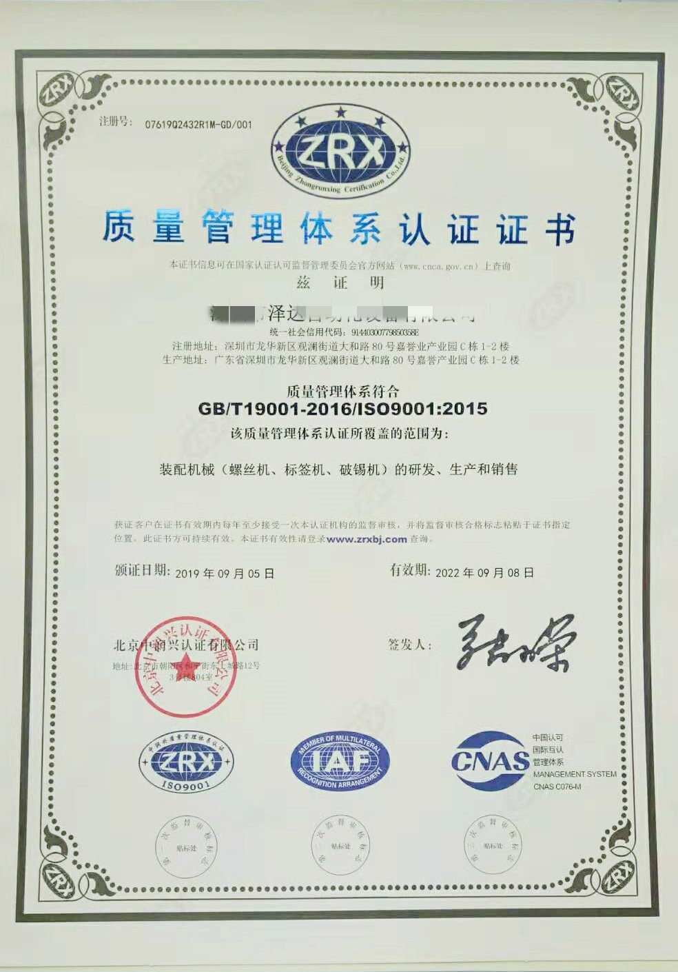 關(guān)于我們已通過(guò)ISO9001質(zhì)量管理體系認(rèn)證